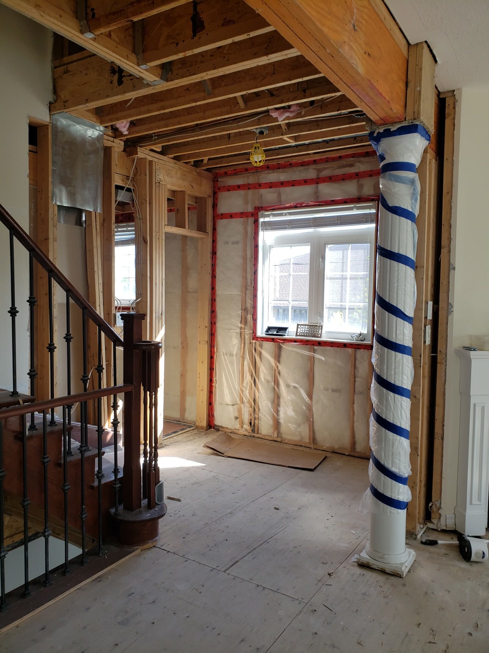 Before: stud-framed wall with exposed insulation batts and a wrapped structural column, before drywall is hung.